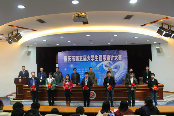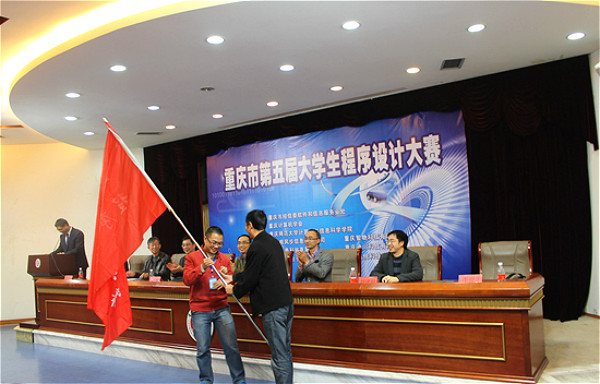 党委书记刘军和重庆计算机学会副理事长马燕教授分别致辞后,由重庆计算机学会秘书长曾一教授宣布比赛获奖名单。此次大赛共评出三等奖34个团队,二等奖有13个团队,一等奖的6个团队,特等奖1个团队。另有优秀组织奖3个。颁奖结束后,我校承办代表李世宏教授将旗帜授予下一届重庆大学生程序设计比赛的承办方重庆工程电子学院的代表。