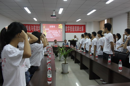 首先,孙柳艳老师与傅帆老师分别就“三下乡”与“带薪实习”暑假社会实践活动做了筹备工作汇报。两位老师谈到,前期筹备工作周全细致,将参与成员的安全放在首位,将于2013年7月-8月组织“三下乡”重点团队开展社会主义新农村建设,信息化新农村建设宣传,城镇基层单位信息化建设以及带薪实习等一系列实践活动。接下来,李月臣院长为学生代表团总支学生书记赵海建授“三下乡”旗帜。赵海建同学双手庄重地从院长手中接过并挥舞展示。第三项议程,由刘书记和李院长为学生代表配发“三下乡”服装。学生会主席常晨带领全体“三下乡”成员进行庄严宣誓郑重承诺。会场气氛严肃高昂,大家内心涌动着完满社会实践任务提高自身报效社会的激情。