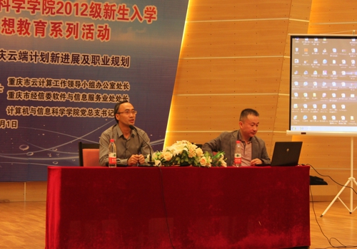 邀请到重庆市云计算工作领导小组办公室处长、重庆市经信委软件与信息服务业处处长居琰博士,于2012年11月1日下午2:30在校友会堂音乐厅为2012级全体新生开展了“重庆云端计划新发展及职业规划”的主题报告。院学工办和2012级辅导员参与报告大会,报告会由学院党总支刘军书记主持。