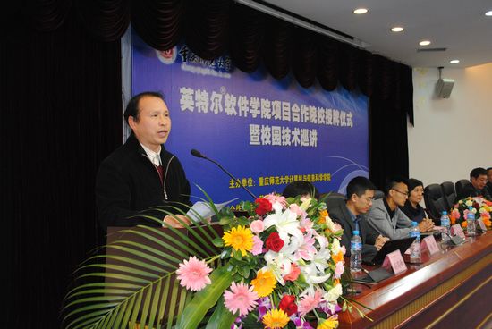 我校教务处长洪全教授代表学校致辞,他指出英特尔在多核处理器方面的成就和校企合作交流的优势,能够达到先进可靠的资源共享,也预祝项目合作取得成功;随后,Intel公司软件研发部亚太总部王兴渝女士上台讲话;她介绍了Intel软件的业务和Intel软件学院的核心力量;学院马燕院长对双方合作的范围进行了介绍并介绍了哔咔漫画