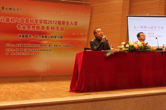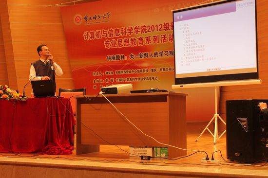 邀请到旭硕科技(重庆)有限公司人力资源部经理林文淦,于2012年11月8日下午在校友会堂音乐厅为2012级全体新生开展了“大一新鲜人的学习观”主题讲座。院全体学工队伍老师参与,大会由学院党总支书记刘军主持。