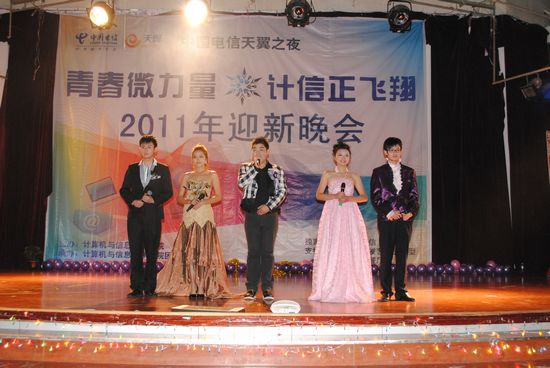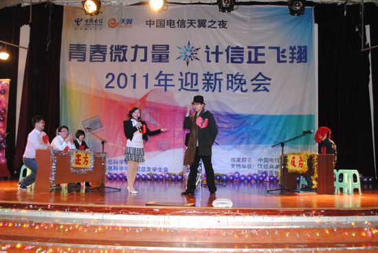 学子参加了整场迎新晚会。晚会由郑洪辉等五人主持。