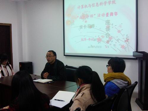 于2011年12月8日下午1:00在集贤楼233办公室举办了“成长导师”一周年活动学生交流会。会议由计信学院党总支书记刘军主讲,10级辅导员梁园源老师主持,10级班学生代表及成长导师联系人参会,共同深入探讨成长导师活动开展一年来的工作情况。