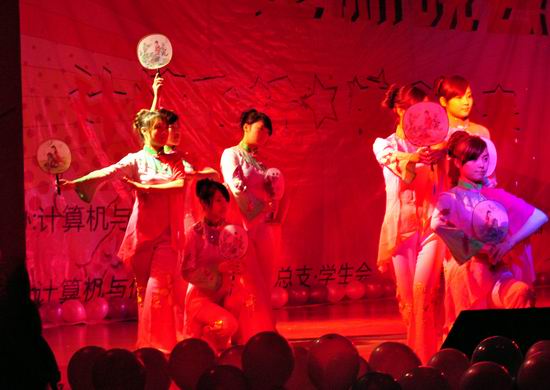 晚会以舞蹈《气球》的青春步伐火热开场,现场气氛也随即如万千气球升腾而上,伴随着优美的旋律,一个个精彩的节目继续上演。火辣十足的《RELIVE》一登台便迅速引爆全场;民族韵味的《雨中花》以其优雅的舞姿将所有观众带入江南烟雨的梦幻佳境;人扇合一的《青花瓷》尽显古典与现代的完美融合,将轻盈与唯美诠释得淋漓尽致;歌曲串烧或深情动人、或活力四射,曲曲扣人心弦;舞蹈串烧别具特色,华尔兹、爵士舞等风格各异的舞蹈轮番上演,与青春碰撞,大家一起狂欢。小品、器乐等表演也使现场高潮迭起、掌声雷动,更有学院老师、研究生倾情助阵,再次升华了晚会主题。晚会最后,团总支学生会全体成员齐登台,一首《爱因为在心中》在会场久久回荡……
