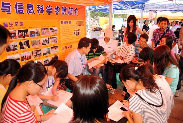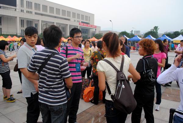 迎新站工作人员热情接待新生,认真办理报到手续。