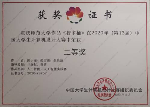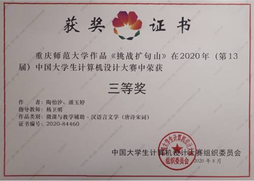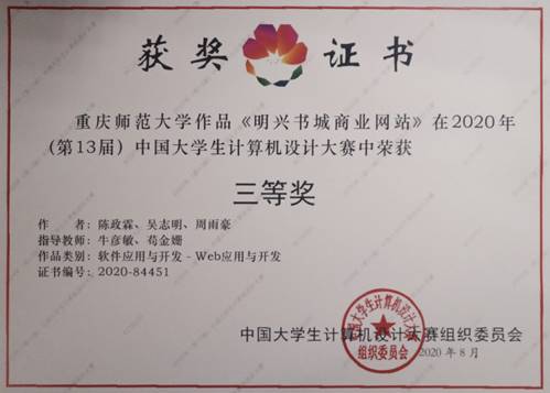 荣获2个二等奖,4个三等奖。由刘巧、王静、陈敏创作,唐万梅老师、李明老师指导作品《turtle库-绘制团旗》,由阳小丽、张雪莲、张贤迪创作,兰晓红老师、孙苗老师指导的作品《智多桶》荣获二等奖。《明兴书城商业网站》、《秒懂李清照》、《挑战扩句山》、《基于php-mysql的送水系统》四个作品荣获三等奖。