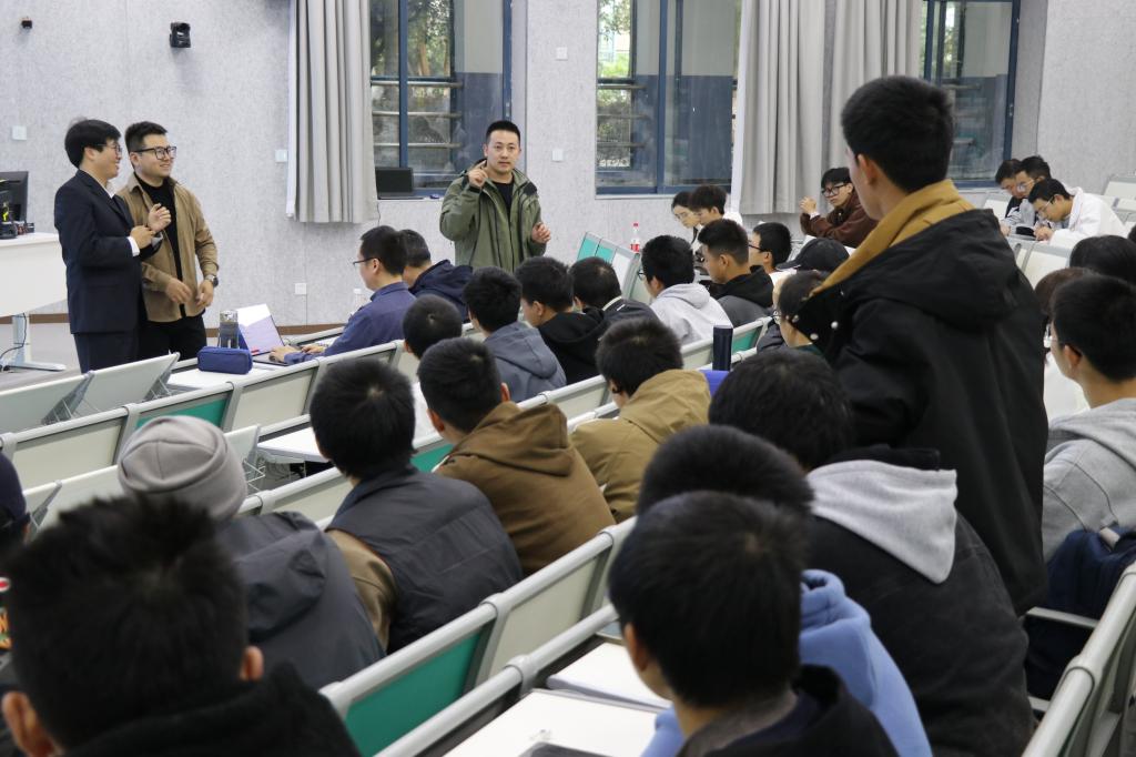 百度飞桨领航团长张青军和软件工程与智能科学专业的一百余位学生。讲座由计信学院软件工程系主任冯骥主持。