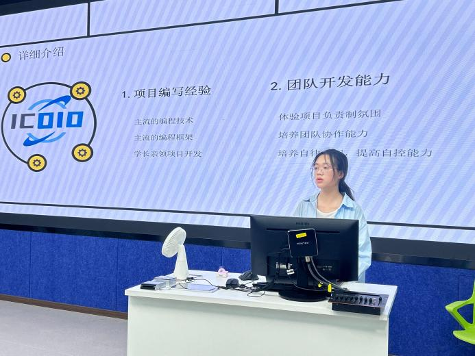 随后,实验室代表刘欣同学为同学们介绍“ICDIO编程夏令营”的学习内容、学习机制等内容,鼓励大家参与夏令营、提升个人核心竞争力。最后,“ICDIO学生实践基地”全体成员为2023级同学们答疑。