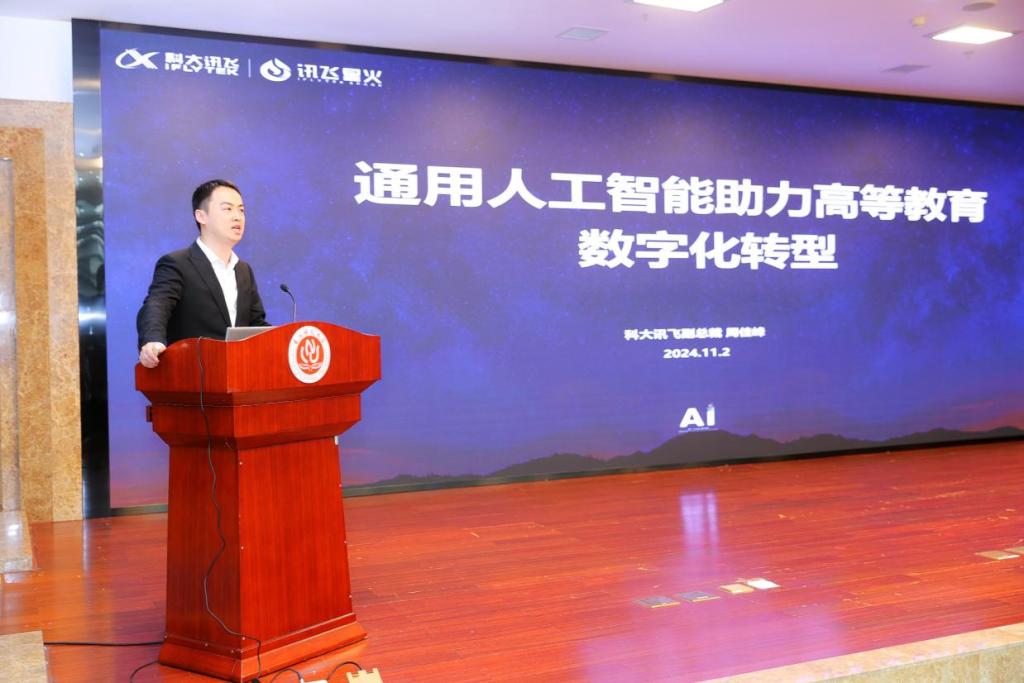 科大讯飞股份有限公司副总裁周佳峰作了题为《通用人工智能助力高等教育数字化转型》的报告,他谈到,人工智能时代,认知大模型为解决人类需求带来新机遇。在AI国际竞争中,构建自主可控的通用大模型至关重要。他介绍了科大讯飞在推动教育数字化升级,提供全场景的高等教育数字化解决方案的成果。