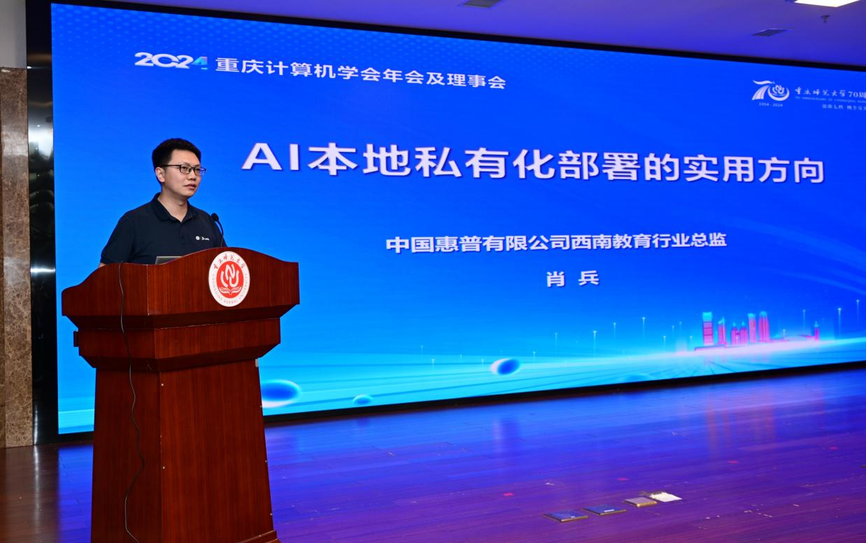 中国惠普有限公司西南教育行业总监肖兵作了题为《AI本地私有化部署的实用方向》的报告,他谈到,在人工智能AI新技术的驱动下,越来越多的高校开设人工智能相关专业和课程,为AI行业培养了大量的专业人才。他介绍了惠普公司基于AI 端侧算力工作站平台进行的私有化部署解决方案等方面的成果。