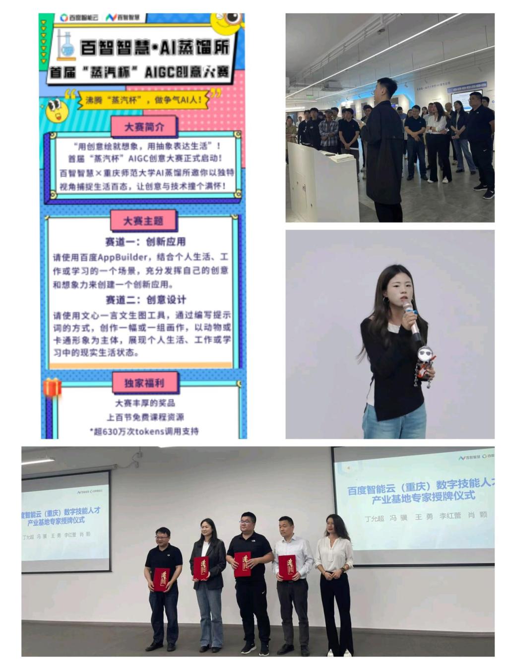 活动重点发布了首届“蒸汽杯”AIGC创意大赛,设置AppBuilder开发与文生图创作双赛道。作为新成立的“AI蒸馏所”社团首秀,大赛吸引了广泛关注。社团代表王敏向师生发出参与邀请。