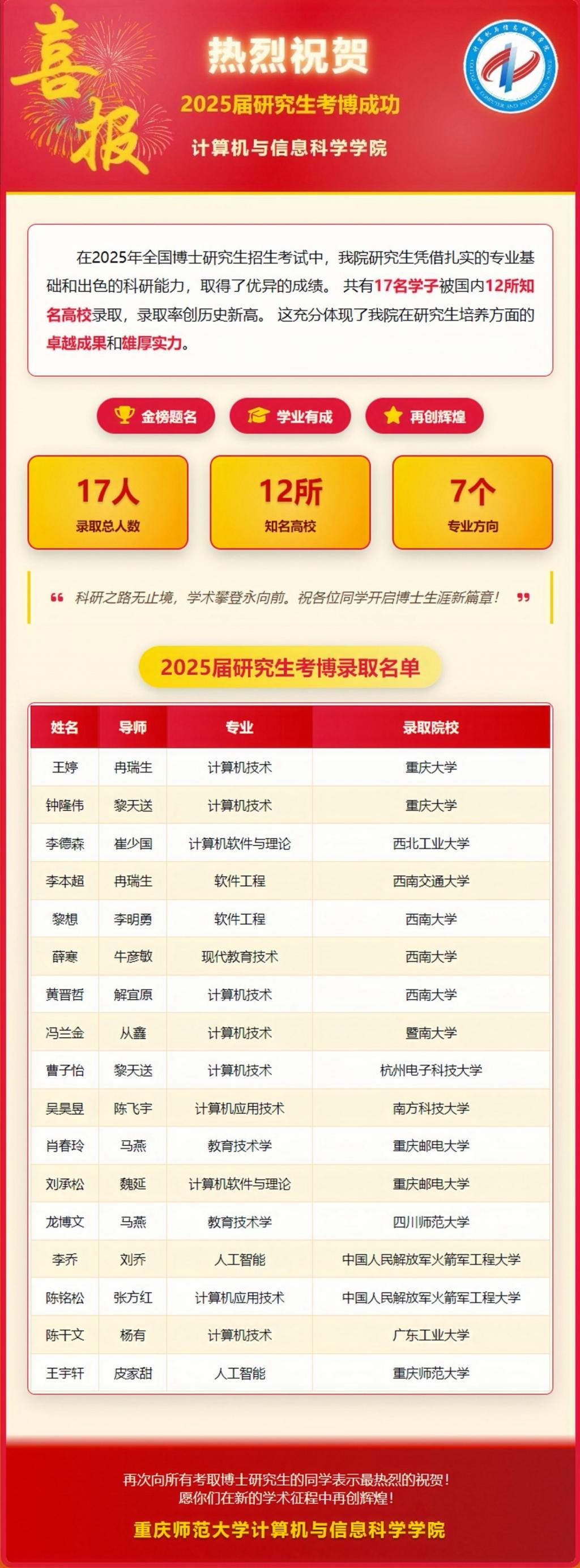 学子考博成功捷报频传,17名毕业研究生凭借过硬的专业素质和学术能力成功录取为博士研究生,即将迈向更高的学术舞台。他们分别被西北工业大学、重庆大学、西南交通大学、西南大学等知名高校录取,录取人数、录取比率和录取院校质量再创历史新高,充分展现了学院研究生培养质量的不断提升。