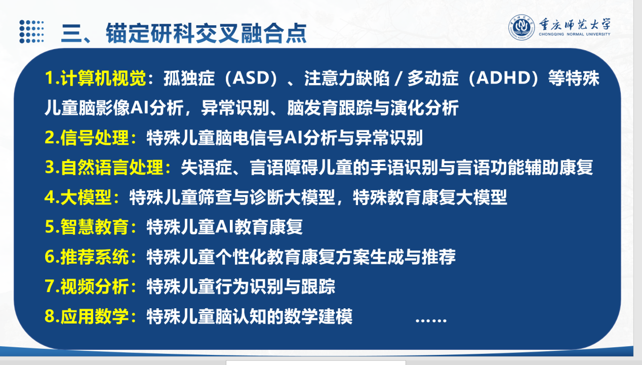 思维,积极响应学校号召,“准确识变,科学应变,主动求变”,围绕党和国家重大战略需求,依托大平台,凝聚大团队,产出大成果。二要紧跟国家和重师战略,抓住难得机遇,积极拥抱学科交叉浪潮,主动推进深度合作。三要锚定研科交叉融合点,聚焦计算机视觉、信号处理、自然语言处理、大模型、推荐系统、视频分析与特殊儿童教育康复场景开展交叉融合研究。