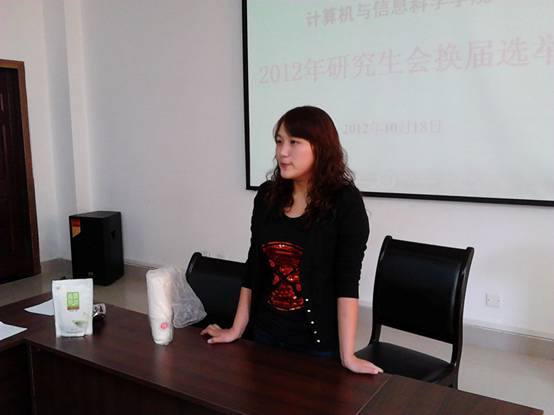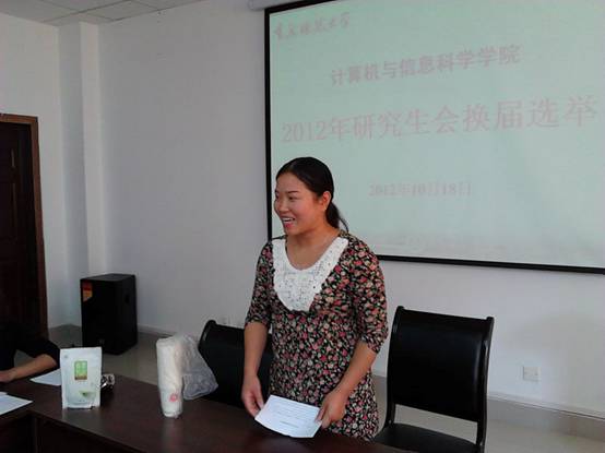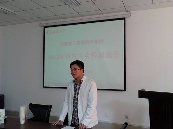 2012年度研究生会换届选举大会在集贤楼233会议室召开。学院研究生秘书李明勇老师以及10、11和12级研究生出席了此次大会,大会由研究生会学术部部长冉燕辉主持。