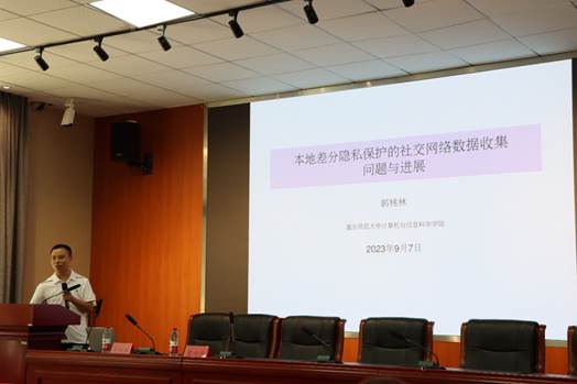 郭桃林的报告题目为本地差分隐私保护的社交网络数据收集问题与进展。在报告中他首先解释了隐私保护、差分隐私及本地差分隐私相关问题,其次从社交关系生成与历史数据收集引出本地差分隐私保护的社交图生成、频繁项挖掘与历史数据收集三个问题,最后介绍了本地差分隐私保护的社交网络数据收集的研究问题与进展。