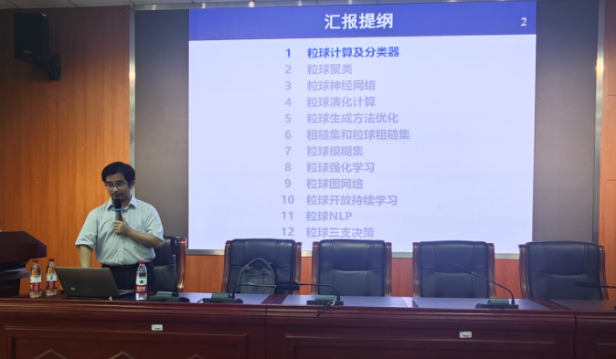 室的主要研究方向与工作内容进行了介绍,其中重点介绍了关于多粒度粒球计算理论的相关研究成果和最新进展,主要包括:粒球分类器以及粒球模糊集分别实现了非点输入的高效、鲁棒的分类方法和模糊计算,初步建立了基于粒球计算的不确定性理论,粒球聚类提升了现有主要聚类方法的效率和鲁棒性;粒球粗糙集统一了经典和邻域粗糙集模型。最后,夏教授向我们指明了高精度的轻量级神经网络学习模型是在未来的努力方向。讲座结束后,现场老师进行了热烈提问,大家分别就小样本数据集训练泛化能力弱等提出问题,夏教授耐心地进行了详细的答疑解惑。