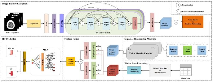 CM-HTNet首先通过3D-CNN骨干网络并发地提取CT序列中每张切片的影像特征,并将这些影像特征按切片顺序拼接,形成可供Mamba网络进行建模的序列数据。然后,CM-HTNet利用Mamba中的选择性状态空间模型(SSM)进一步捕捉切片序列之间的复杂关系,并利用Mamba特性来优先选择处理与HT预测相关的特征,忽略序列数据中与预测任务无关的冗余特征。此外,CM-HTNet框架中还集成了改良的邻域粗糙集(KRS)算法进行临床特征选择,并利用交叉注意力机制将临床数据与影像数据融合,采用多模态机器学习来进行HT风险预测。