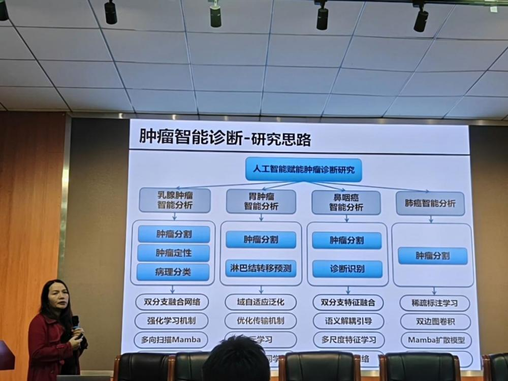 室的主要研究方向与工作内容进行了介绍,其中重点介绍了医学图像处理和人工智能在肿瘤诊断领域的相关研究成果和最新进展,报告主要涵盖以下方面:针对乳腺癌的多临床流程智能分析;基于多中心CT影像的胃癌对应分析;鼻咽癌的早期诊断与预防策略;以及肺癌CT影像的智能分割模型。最后,雷柏英教授进一步展望了人工智能技术在肿瘤精准诊疗应用方面的未来趋势与挑战。