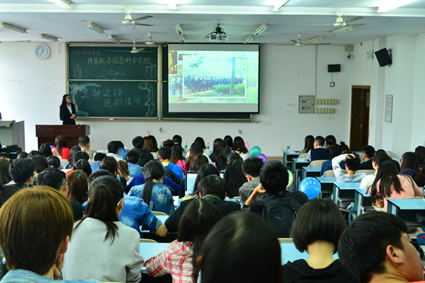 2015-2016学年度支部达标述职演讲在宏德楼5202教室举行。到场的评委有计信学院团总支书记钟华、14级辅导员姜扬和团总支学生会主席团成员以及各部门部长。