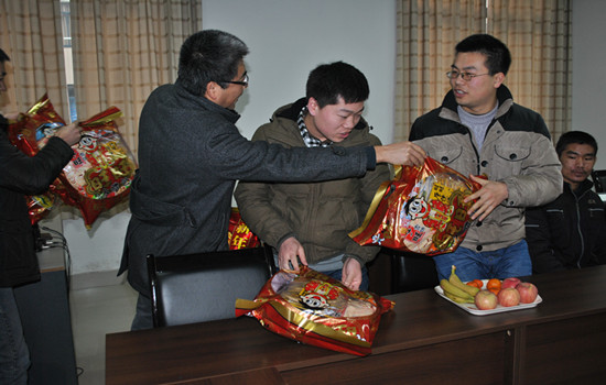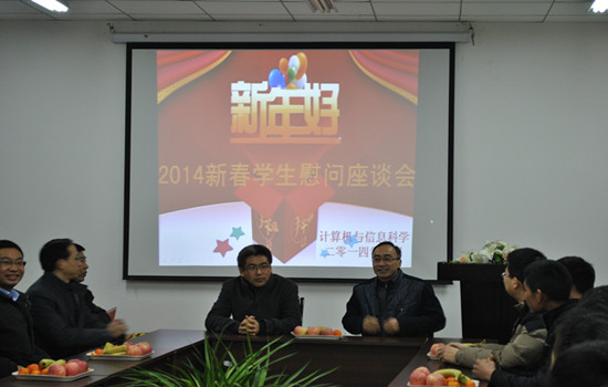 会上,刘军书记首先向各位同学致以最诚挚的问候,他与大家一起回顾学院成立以来取得的佳绩,鼓励大家珍惜大学时光,为计信学院的成长添砖加瓦。接着,各位老师与同学们作了亲切交谈,详细了解了同学们的家庭基本状况、学习情况、在校生活情况。最后,领导老师们一起给同学们送上了新年的祝福和小礼物,祝愿大家能够与家人度过一个欢乐、温暖、祥和的春节。