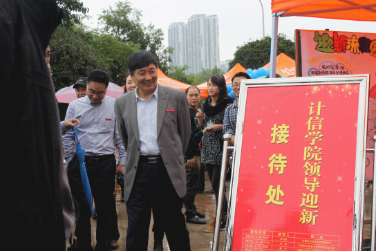 党总支书记刘军、院长李月臣、副院长李世宏、杨德刚,党总支副书记杨宇、办公室主任罗世祥亲临迎新大本营现场,其中主要党政领导实行“领导迎新接待制”,制作的有“计信学院领导迎新接待处”迎宾牌,坐镇迎新现场解答新生及家长的疑问,受校领导班子的一致好评。