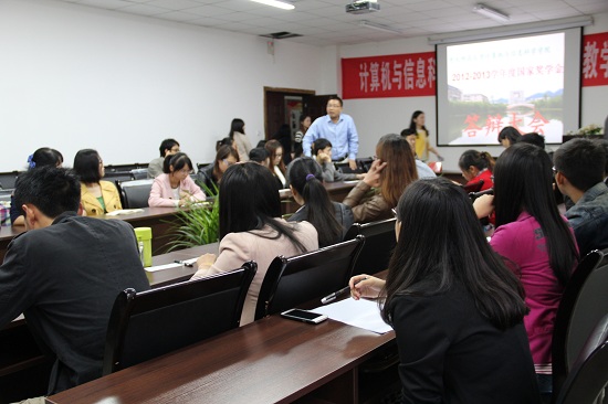 于集贤楼233室举行2012-2013学年度国家奖学金答辩会。党总支副书记、评审小组组长杨宇老师,团总支副书记张敬老师,辅导员朱嘉洁老师、傅帆老师、孙柳艳老师以及各年级各专业学生代表共18位同学出席会议。本次会议,由辅导员助理王节老师和相玲老师担任监票员。