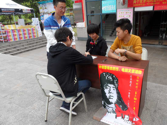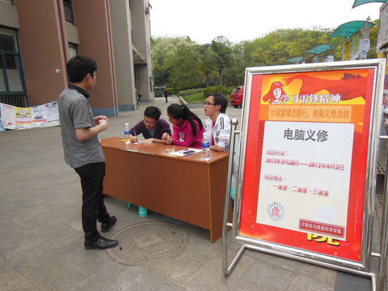 团总支学生会各部门协调合作共同举办了以“书写我的雷锋日记”为主题的电脑义修活动。通过专业与奉献相结合,为全校师生服务。活动于2013年3月28日下午2:00,在我校各个食堂火热开展。据悉,活动周期为一周,此次活动由哔咔漫画