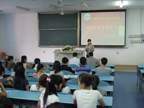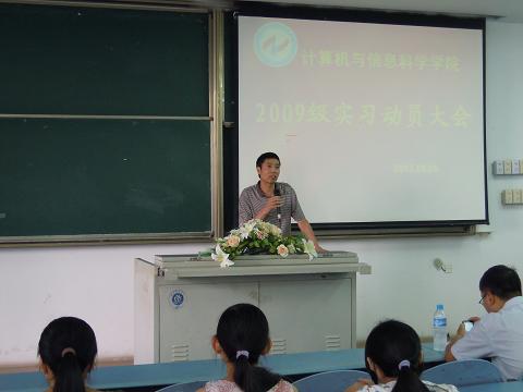 金秋九月,天高气爽,又是一年毕业生实习日。计信院为了保证毕业生实习阶段工作的顺利开展,2012年9月6日下午2:30在弘德楼5204教室举行了毕业生实习动员大会,计信学院2009级全体学子济济一堂,参加会议的领导有:副院长李世宏、党总支副书记杨宇,此次大会由09级辅导员朱嘉洁老师主持。