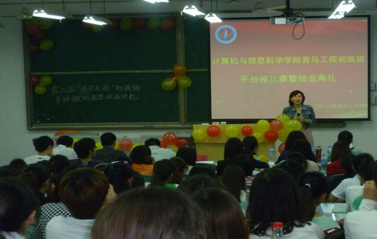 比赛结果的等待过程中,多才多艺的“青马学员”、评委纷纷登台,为活动献唱,赢得阵阵掌声。最后,主持人宣布了手抄报比赛的一、二、三等奖获得组,其中,2010级第1小组以优异的表现拔得头筹,孙老师为获奖小组颁奖并合影留念。接下来,现任学生书记苗依对学院第二期“青马工程”班系列课程及活动的开展做了最后的总结,她希望“青马学员”秉承优良传统,再接再厉,在今后的学习生活中将学院的“青马精神”发扬光大。至此,本次“青马工程”初级班手抄报比赛暨结业典礼圆满落幕。