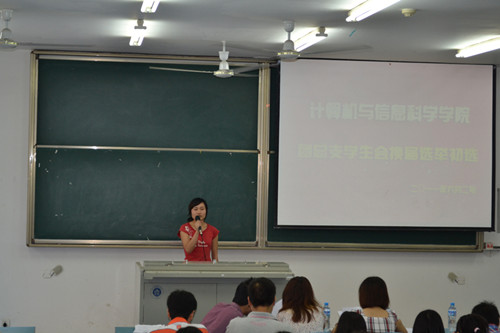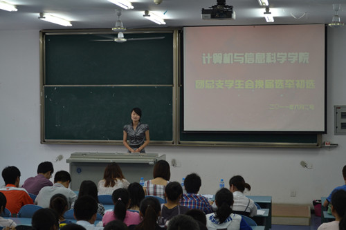 2011年6月2日下午2:30,计信学院第三届团学会换届选举初选在弘德楼5203拉开帷幕。09级辅导员朱嘉洁、10级辅导员梁圆源以及第二届团总支学生会主席团成员参与了本次活动并担任评委。