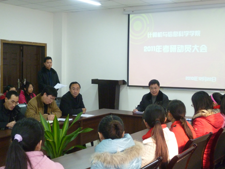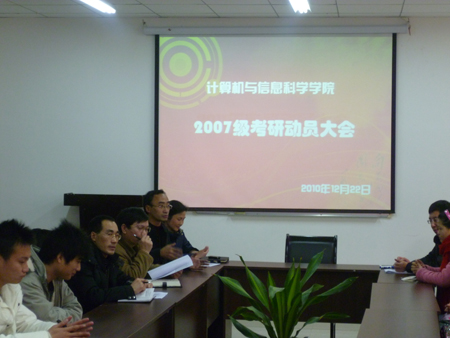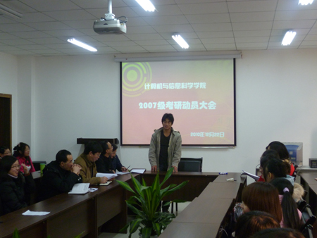 在集贤楼233办公室组织举行了2007级考研动员大会。马燕院长、刘军书记、魏延和杨晓红副院长、李晓燕副书记等党政领导参与了本次大会。大会由团总支副书记张敬主持。