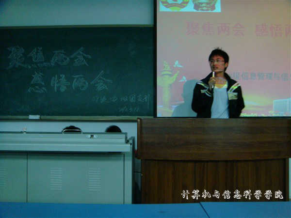 据悉,各个年级主要采用了知识问答、专题演讲、墙报比赛等活动形式,对“两会”精神进行了学习。在学习活动中,同学们就本次“两会”所关注的问题,如“经济发展、民主建设、教育公平、网络问政、低碳经济、上海世博”,进行了重点学习,其中大学生就业与创业、网络安全等问题,成为各个支部学习的热点。如08级信息管理与信息系统支部,学习讨论的两个话题:“大学生毕业后是先就业还是先创业”,“社会经营性网吧是否应该关闭”,得到了同学们积极参与,该讨论引发了同学们对关系自身发展问题的广泛关注。记者从各个活动现场获悉,活动之初,老师们悉心指导;活动现场,同学高度参与,注重细节工作,大到活动策划,小到PPT制作、教室场地申请都做了严密的工作安排。