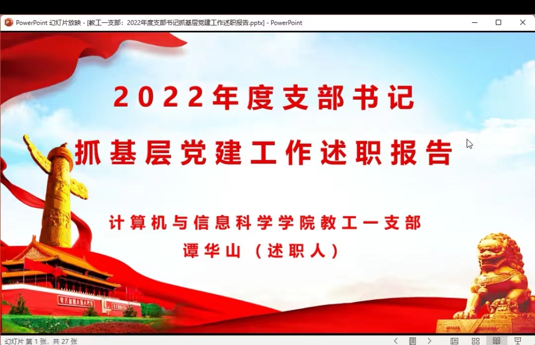 大会上,各位党支部书记逐一进行述职。教工一党支部书记谭华山老师谈到,教工一党支部始终坚持政治理论学习摆在首位,扎扎实实开展理论学习和形式丰富多样的主题活动,广大党员在疫情期间发挥先锋模范作用,下沉社区,发光发热;教工二党支部书记叶青老师介绍了疫情期间支部的业务工作与党建工作有机结合,支部教师党员交流探讨如何熟练运用网课平台,提高网课教学质量。叶老师还特别针对“网课爆破”这类突发事件,通过案例教学,生动演绎网络爆破模拟,让大家防患于未然,增强互联网课堂掌控本领;研究生一党支部书记宋婷婷老师详细介绍了支部本年度开展的组织生活,重点介绍了支部如何努力完善管理制度、打造特色亮点活动以及疫情期间党员同志的先进事迹;研究生二党支部蒋明宇老师谈到,本党支部将志愿活动与哔咔漫画