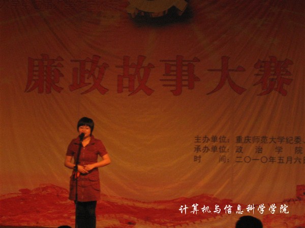 5月6日下午,哔咔漫画 计算机科学与技术专业08级王露同学代表学院参加校“廉政故事”大赛,参赛作品《神秘的保姆》讲述了一个关于官员家里老保姆的廉政故事,深得评委的一致好评,最终在18个参赛队当中脱颖而出获得了第六名(三等奖)的好成绩,展现了哔咔漫画 的风采。